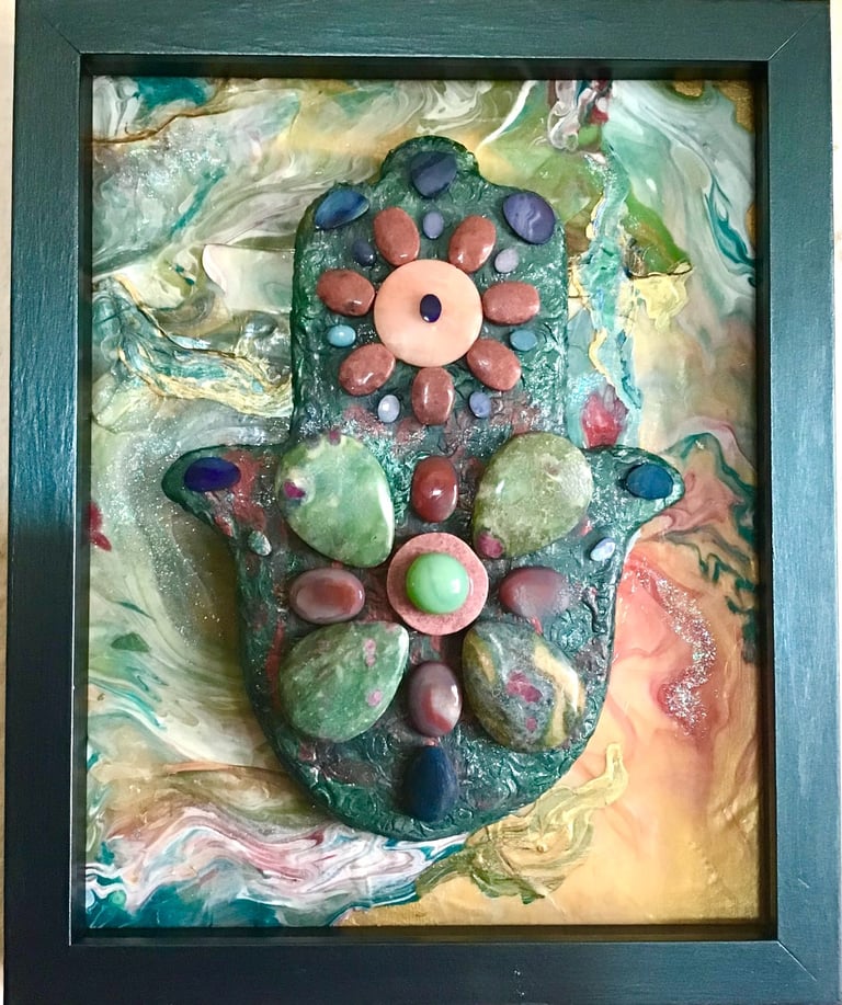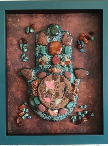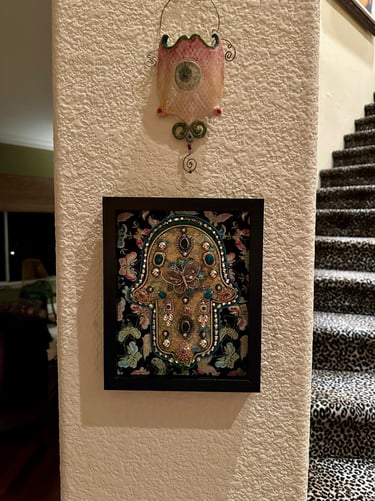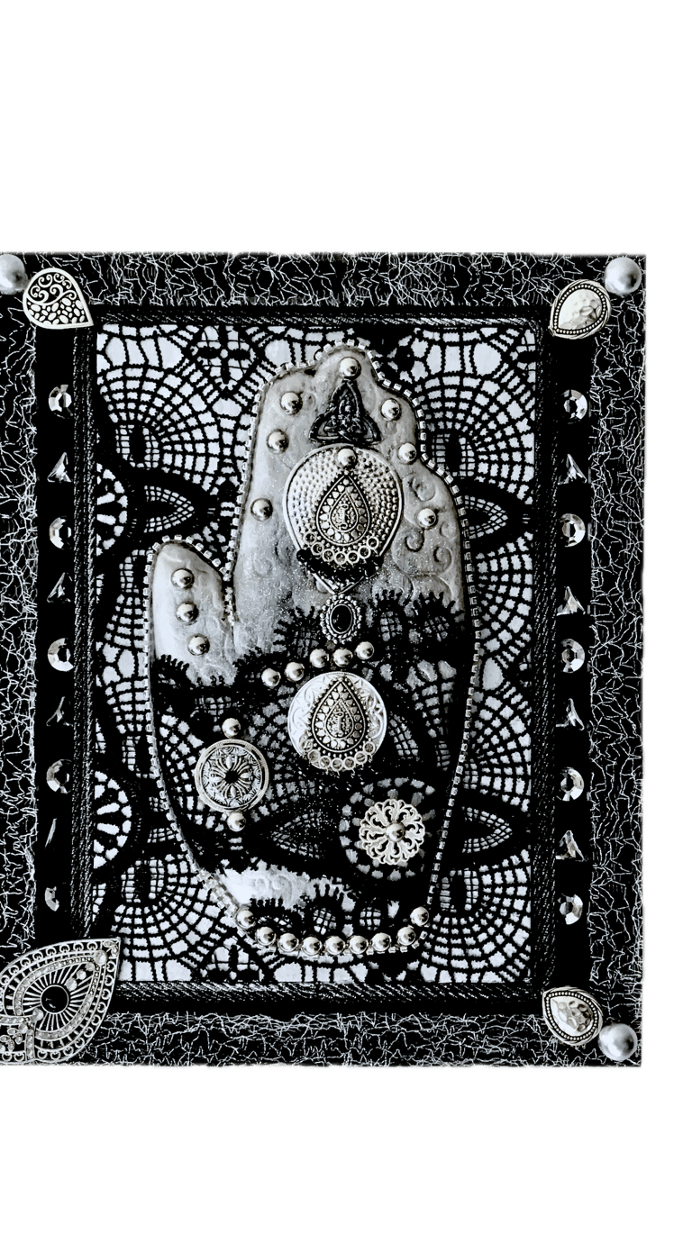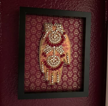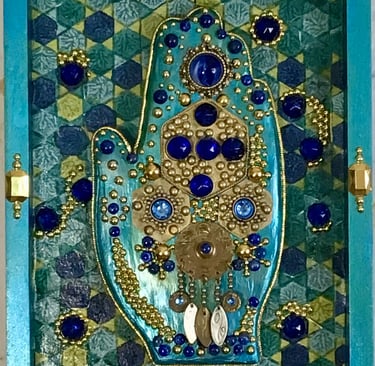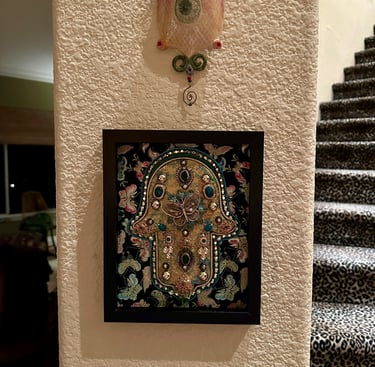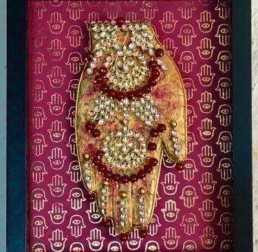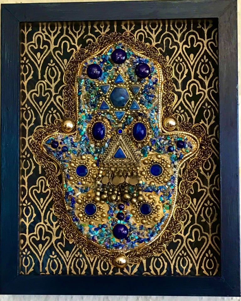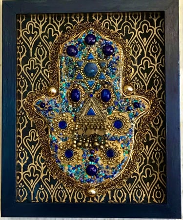 Influenced by her recent visits to Morocco, artist Valerie Caveglia presents a reinterpretation of a traditional cultural theme, the Hamsa Hand, and blends cultures into an art piece that is both meaningful and beautiful. She has meticulously handcrafted each design, drawing inspiration from her collection of ephemera and artifacts. Her framed Hamsa Hands are perfect for mounting on any wall or over a doorway.