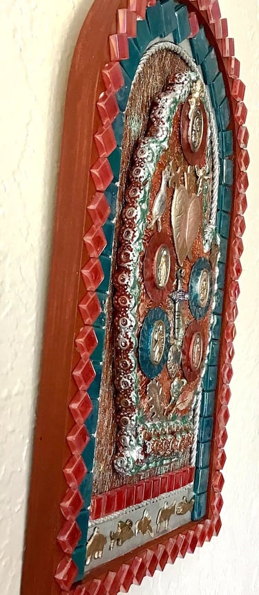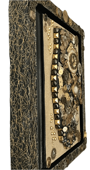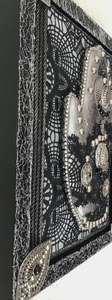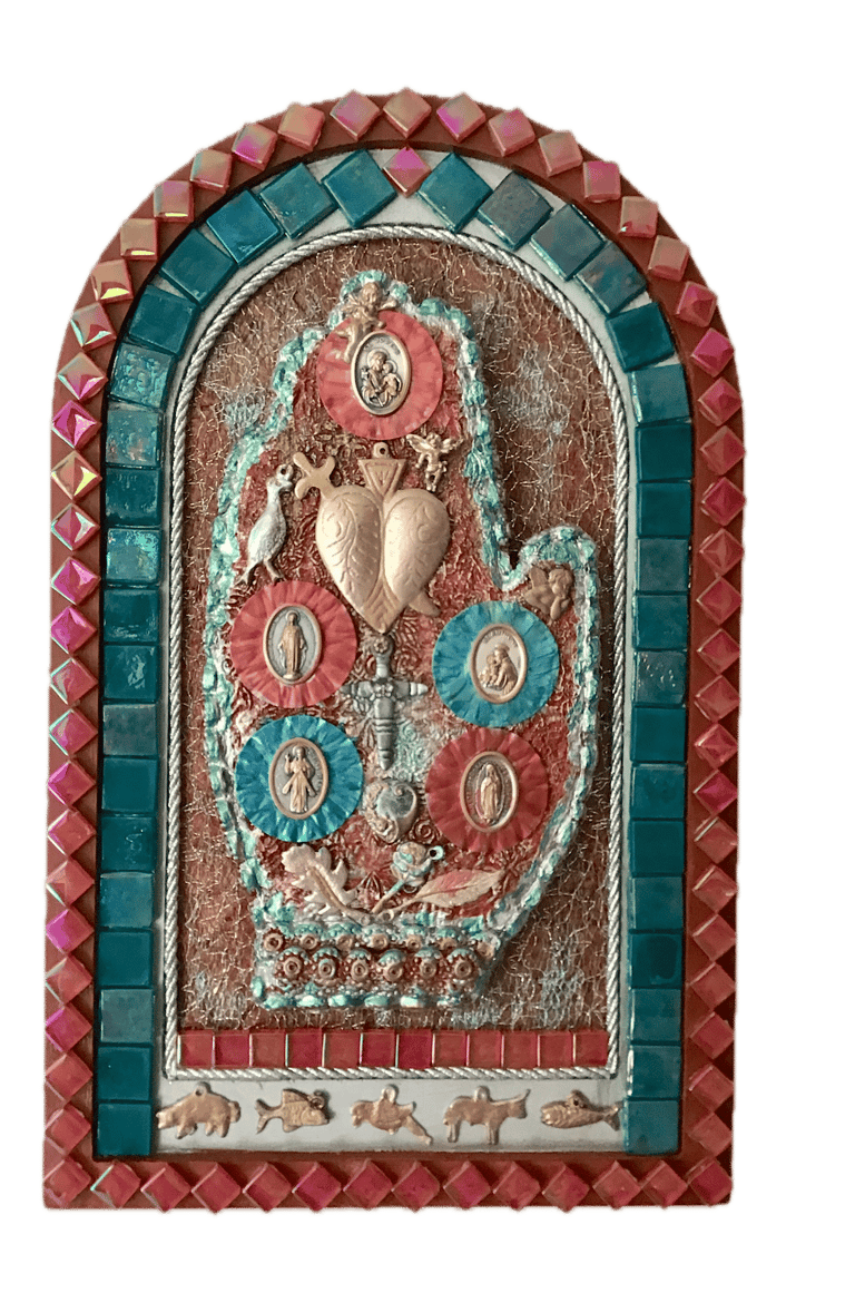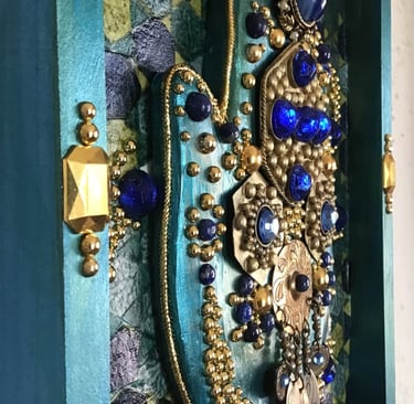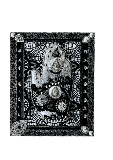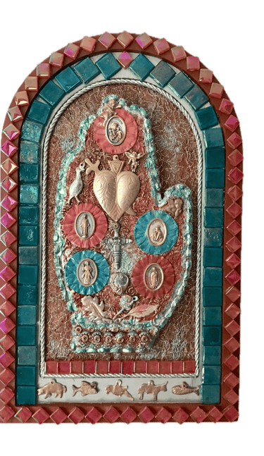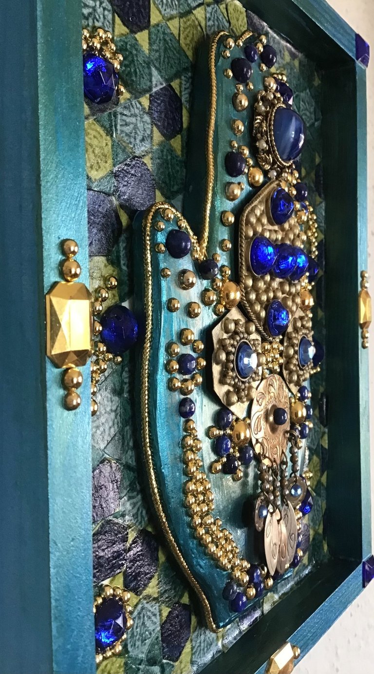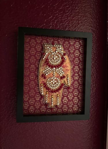 Influenced by her recent visits to Morocco, artist Valerie Caveglia presents a reinterpretation of a traditional cultural theme, the Hamsa Hand, and blends cultures into an art piece that is both meaningful and beautiful. She has meticulously handcrafted each design, drawing inspiration from her collection of ephemera and artifacts. Her framed Hamsa Hands are perfect for mounting on any wall or over a doorway.