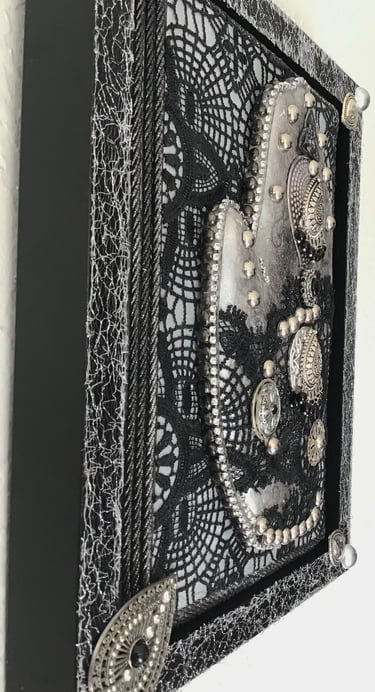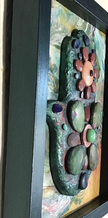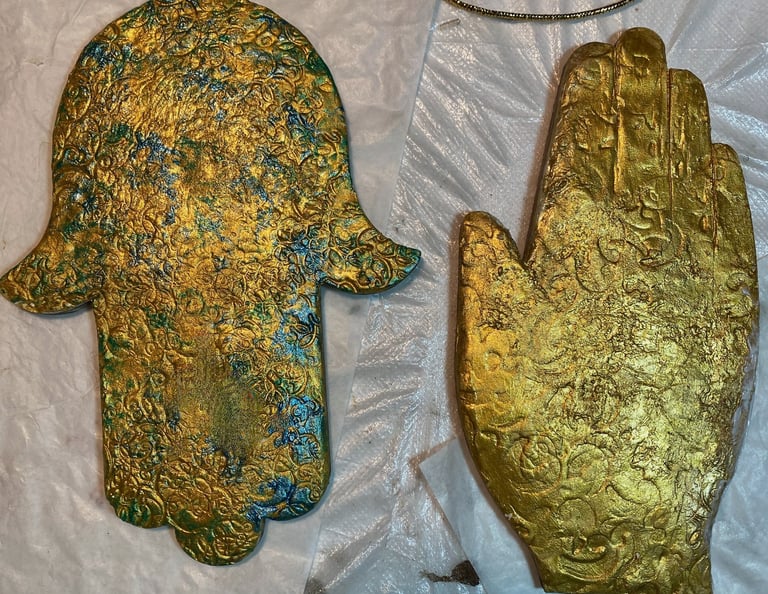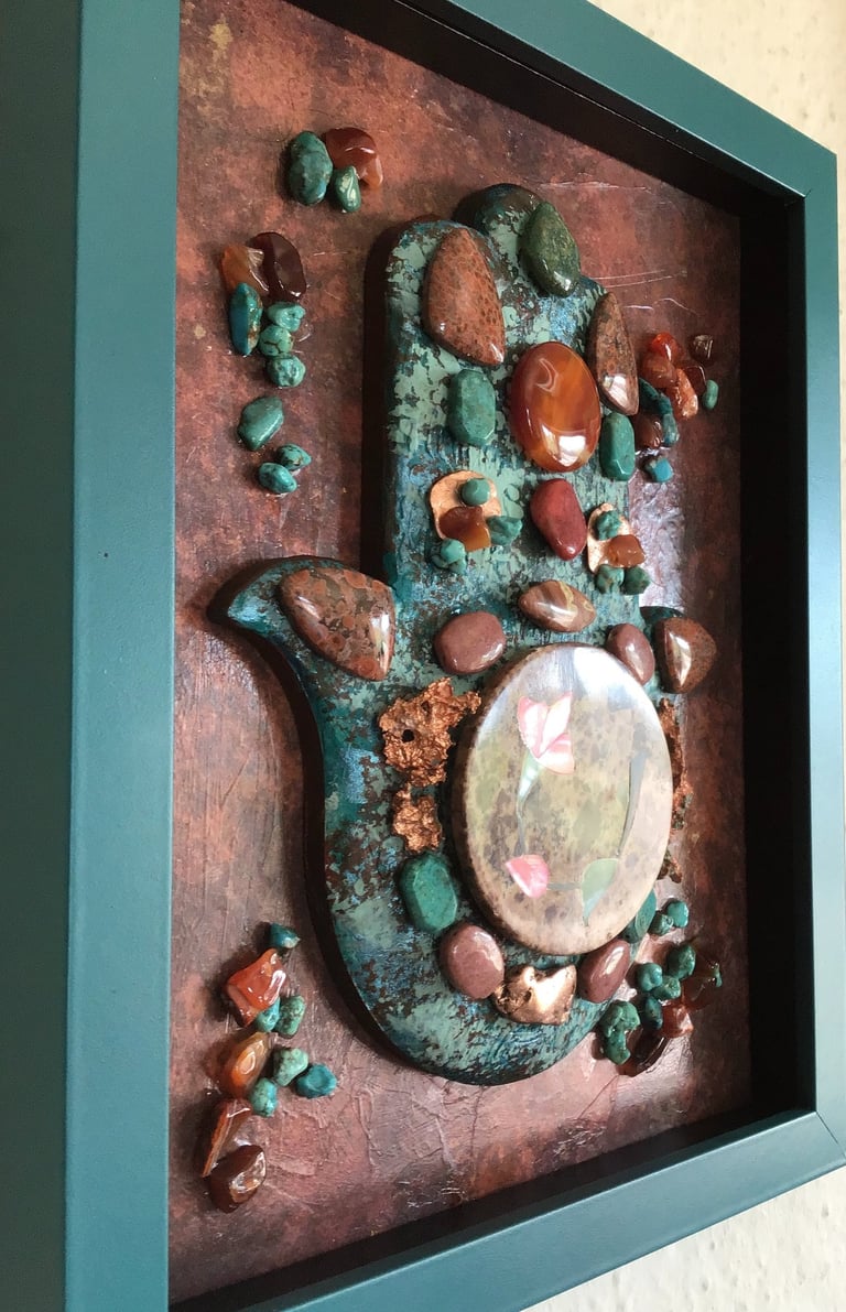 Paint is applied, and then the adornments. After the hand is done, the frame, mat, or plaque is decorated to compliment, and after a lot of detail work, another beautiful hand emerges.