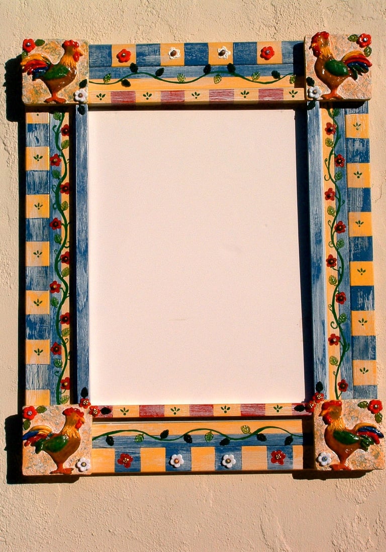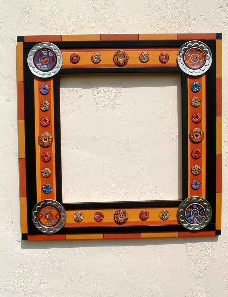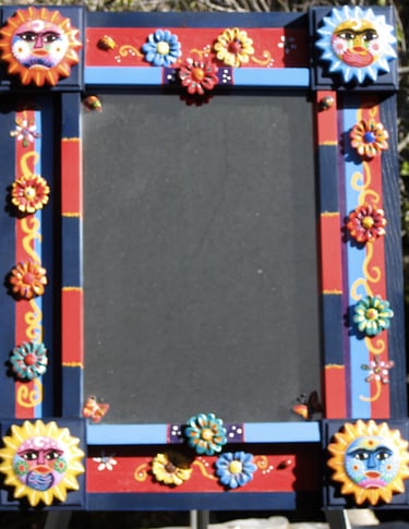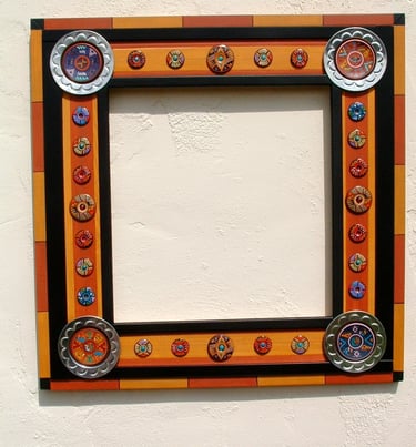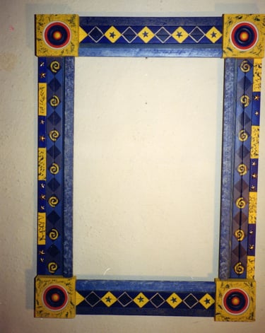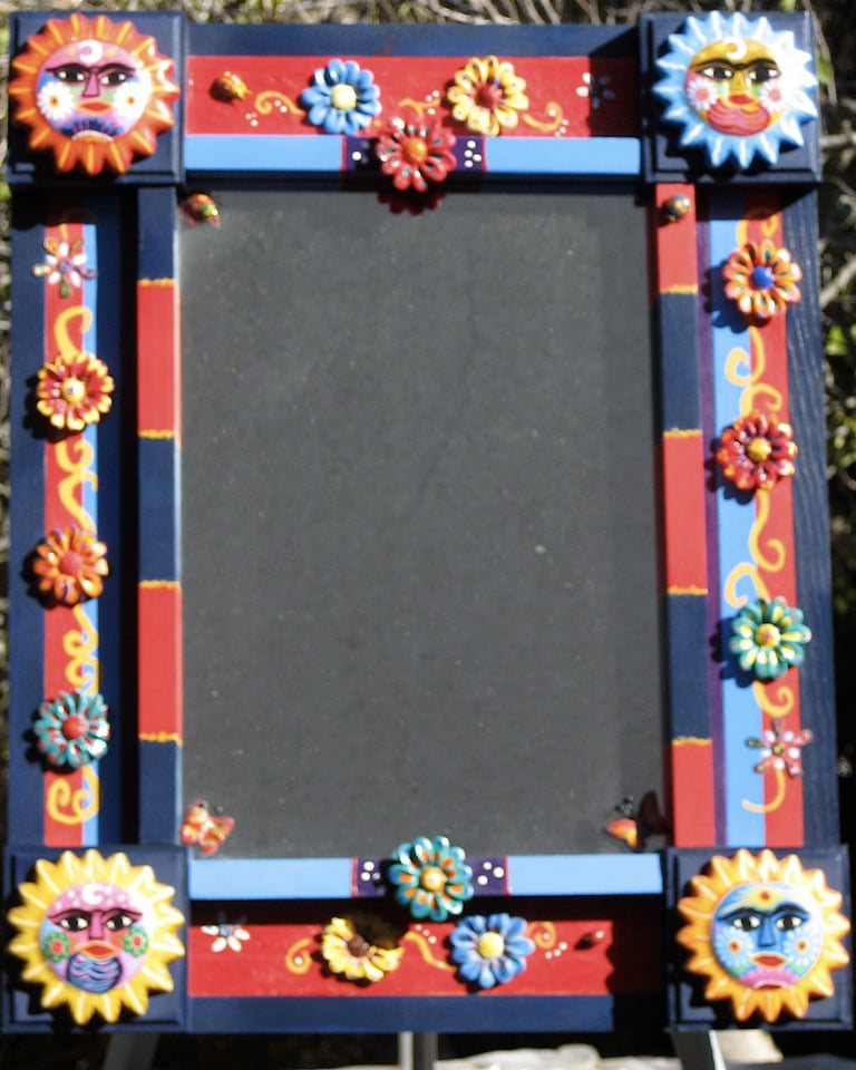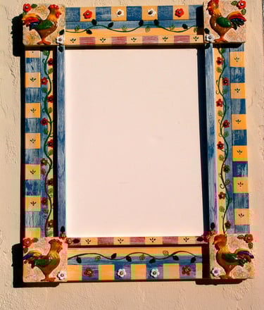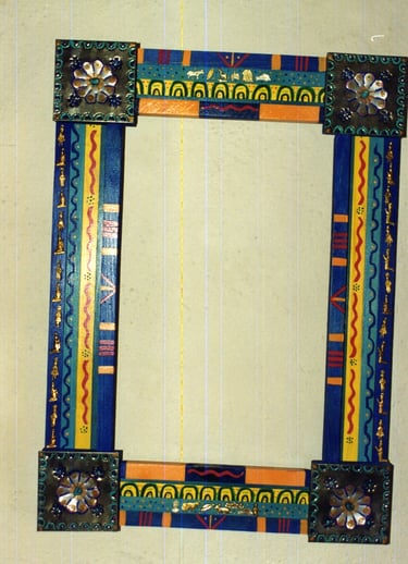 These frames were handmade, painted, and decorated by me. Many of my inspirations came from a tile or a piece of folk art that I could incorporate into the frame. Sometimes I just went with a theme that sparked a creative idea. Inspirations were always waiting in bead stores, flea markets, tile stores, and in the market areas of all the cities in Latin America, Asia, and Europe that I loved visiting!
