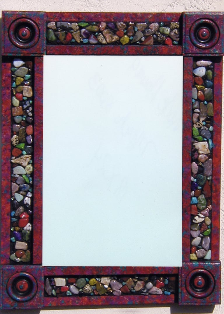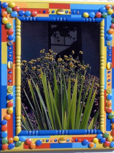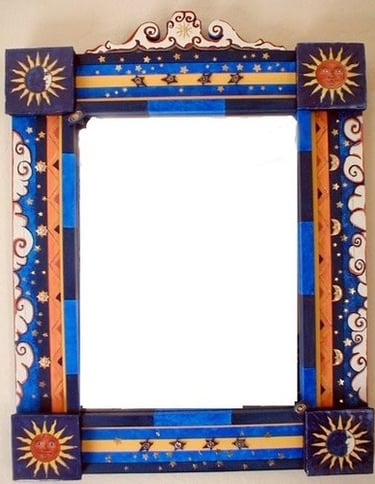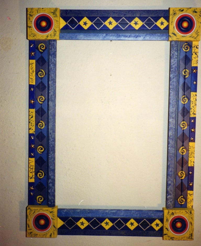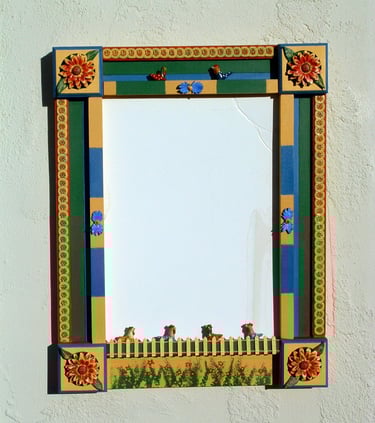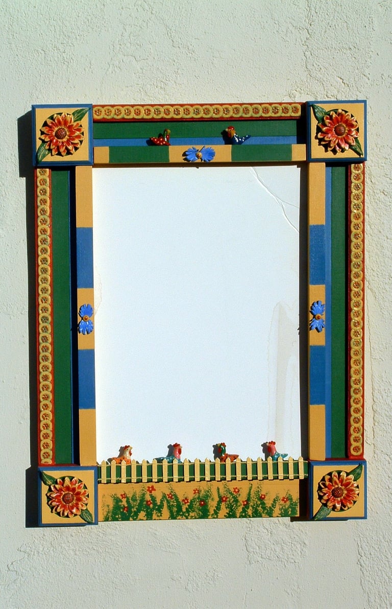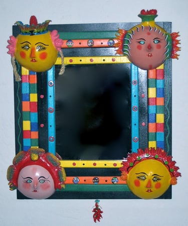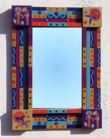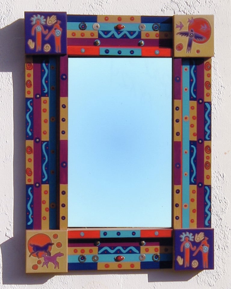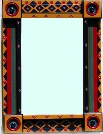 From my artist resume: "Using 1x1 pine sticks, she developed a technique for building a sturdy mirror frame. In many of her works, the art is the frame itself. The mirror frames create a multi-media composition reflecting design elements from other cultures as well as whimsical themes".