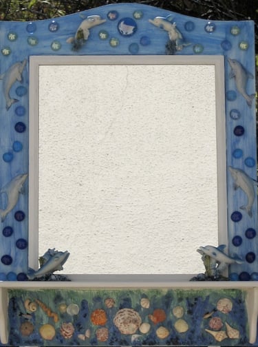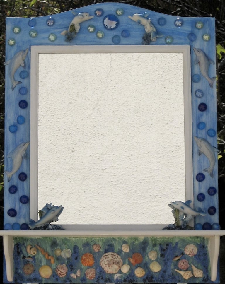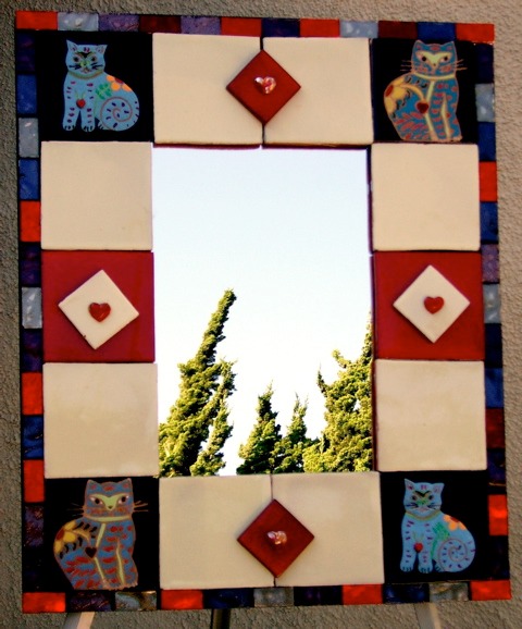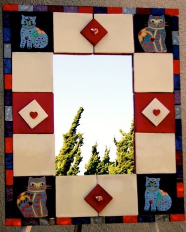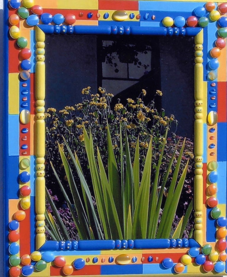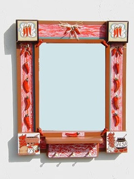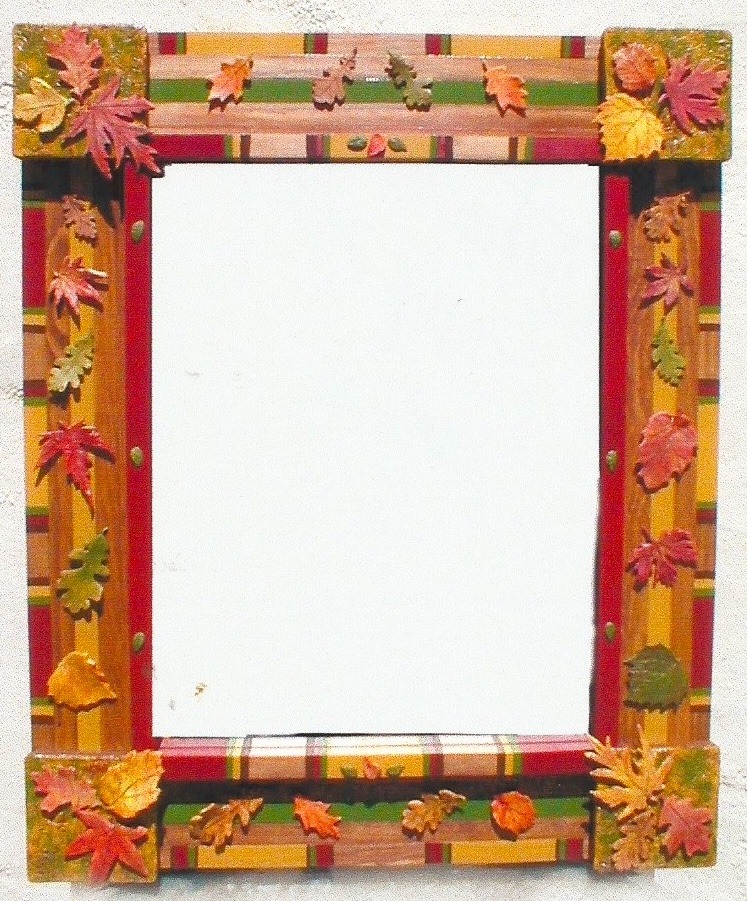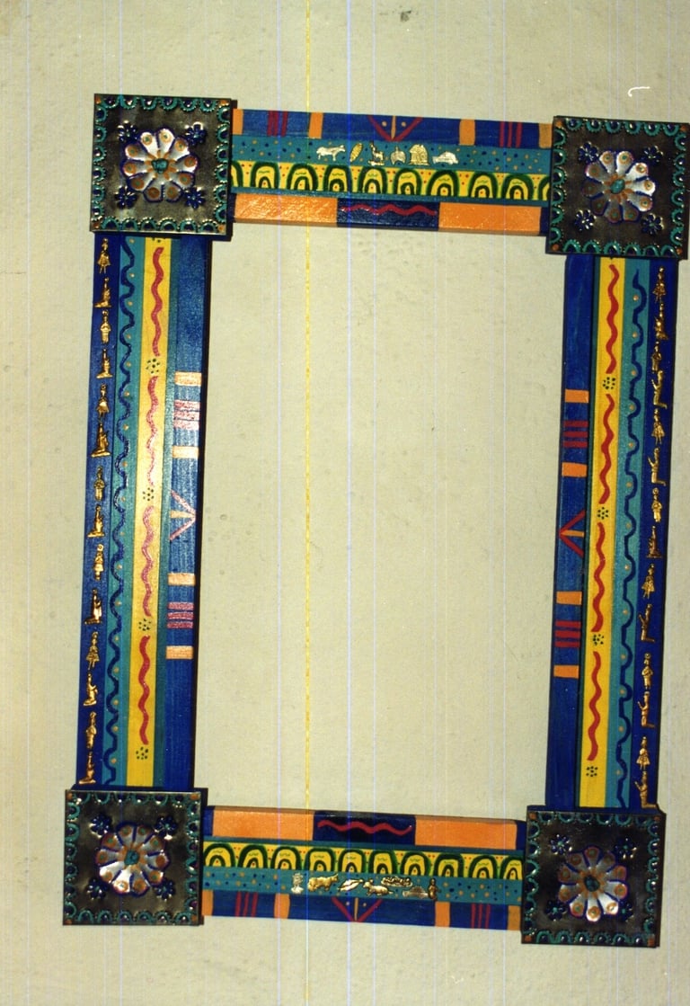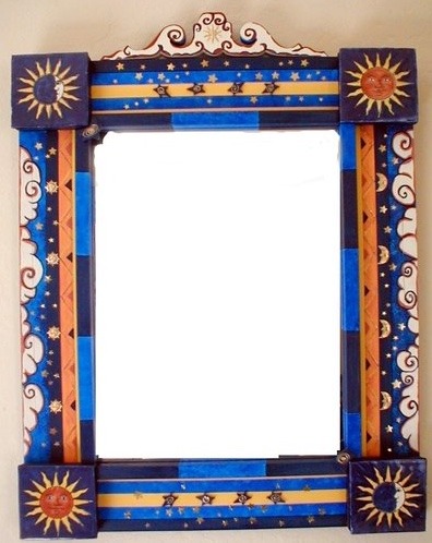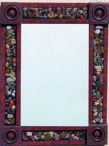 From my artist resume: "Using 1x1 pine sticks, she developed a technique for building a sturdy mirror frame. In many of her works, the art is the frame itself. The mirror frames create a multi-media composition reflecting design elements from other cultures as well as whimsical themes".